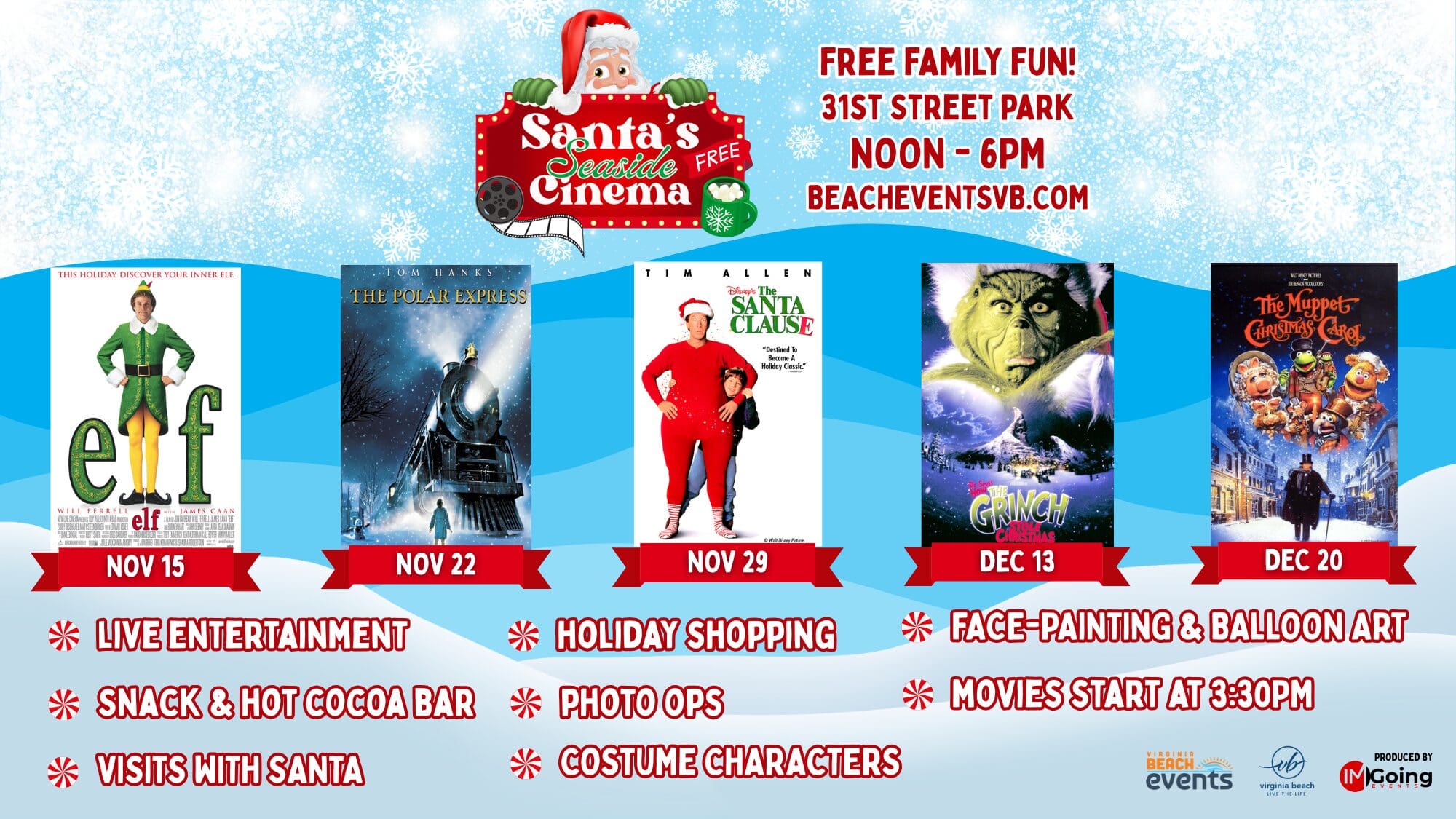 Festive family fun awaits at Beach Events’ newest event, Santa’s Seaside Cinema! Enjoy live entertainment, visits with Santa, holiday shopping, a snack and hot cocoa bar, photo ops, costume characters, face-painting and balloon art, and holiday movie screenings.